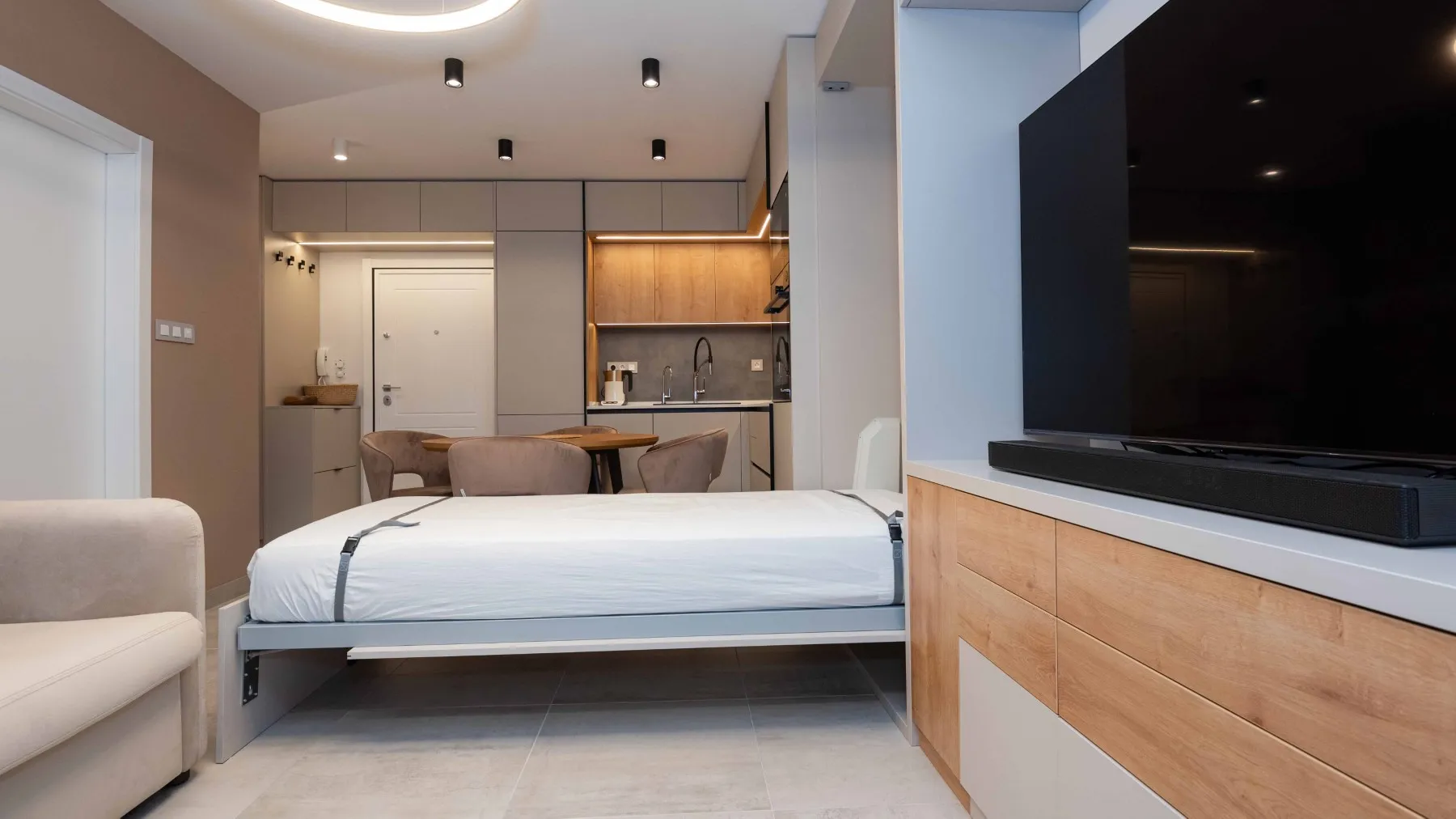 Спалнята трябва да осигурява спокойствие, комфорт и достатъчно място за съхранение. Добре проектираното обзавеждане включва правилно разположение на леглото, функционални гардероби и подходящо осветление за хармонична атмосфера.