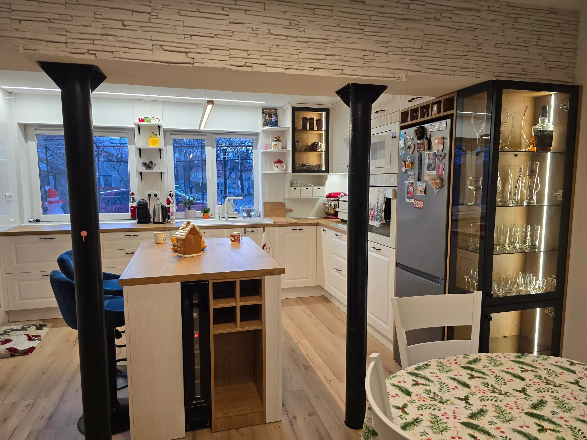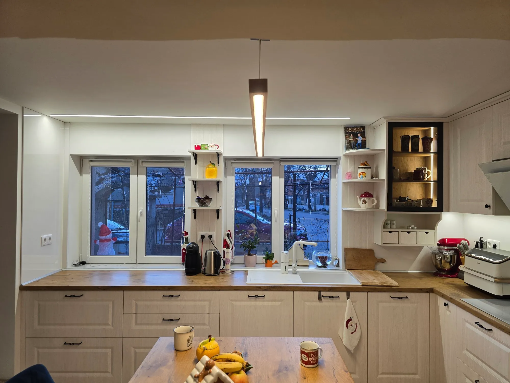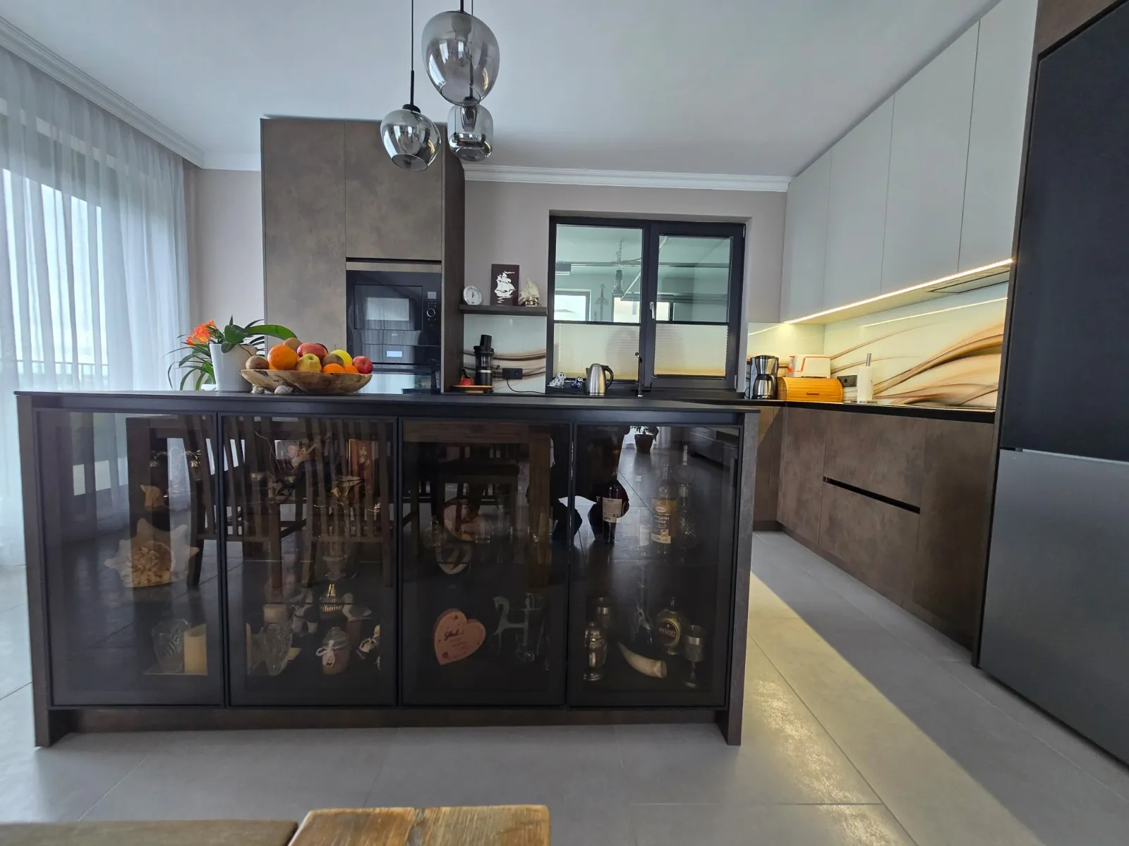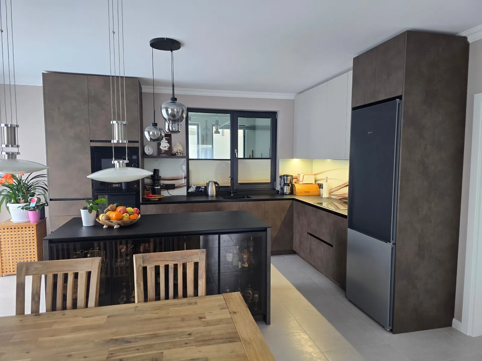 Топлите тонове и осветлението превръщат кухнята в място за общуване.