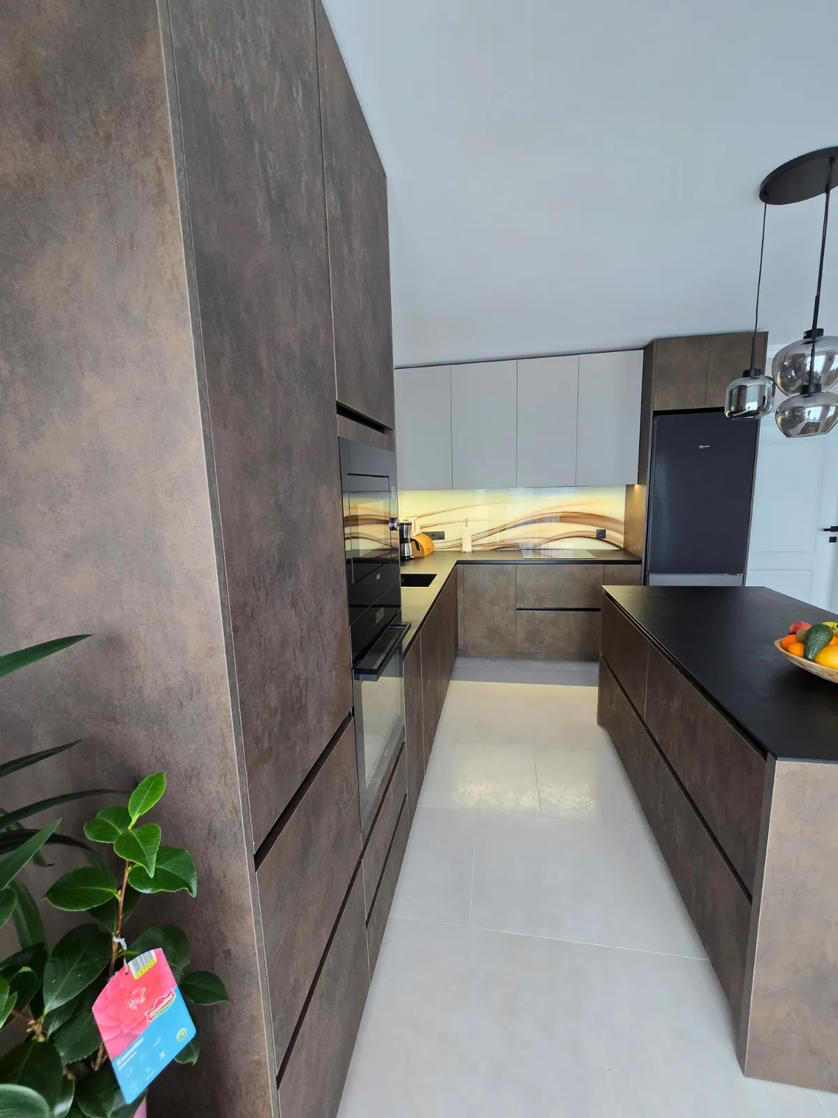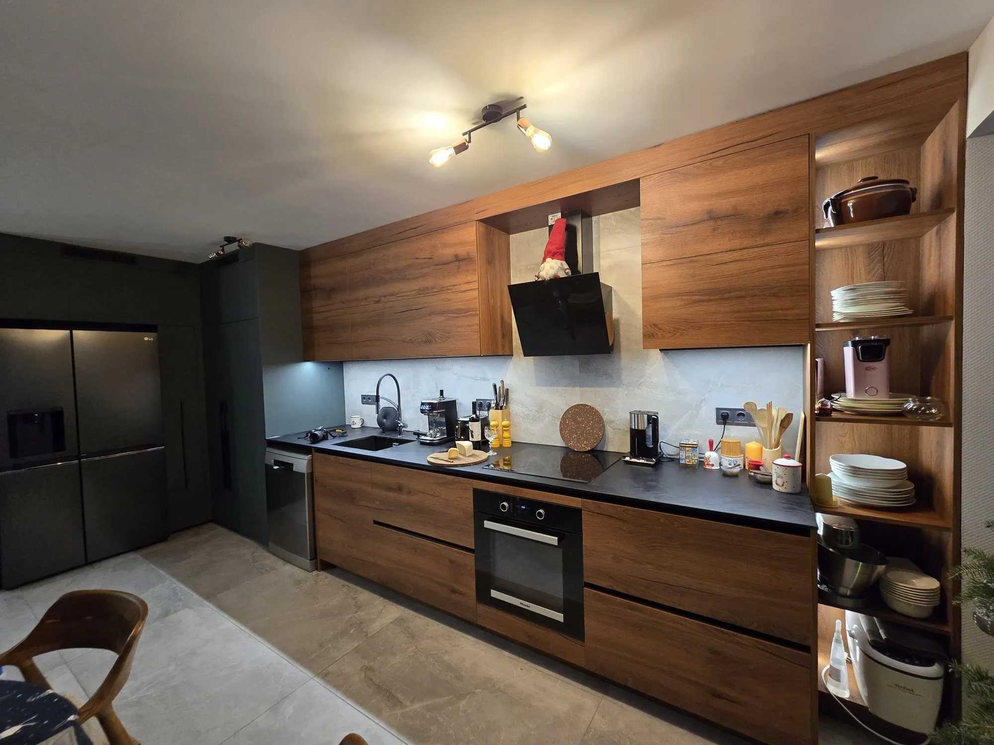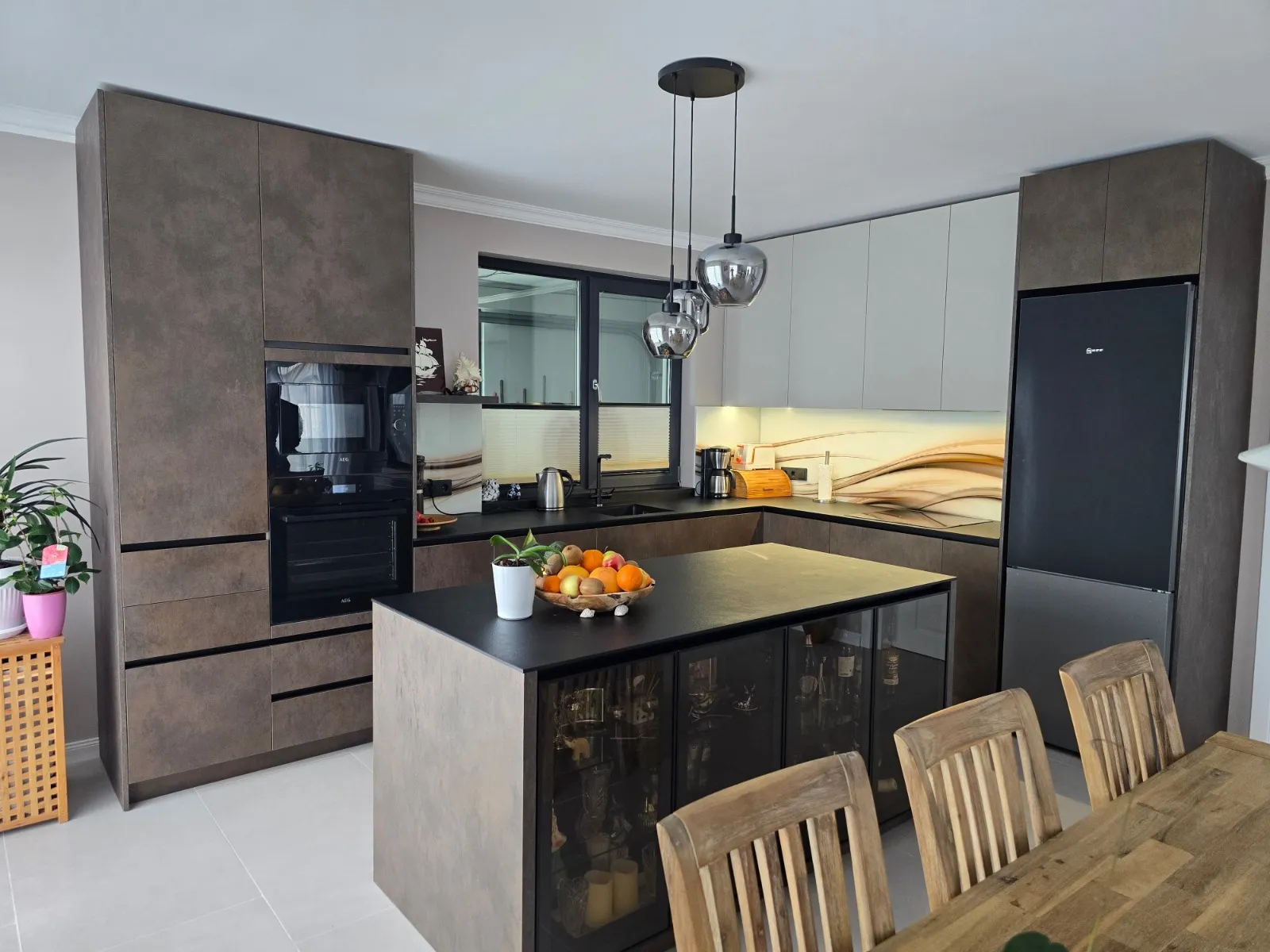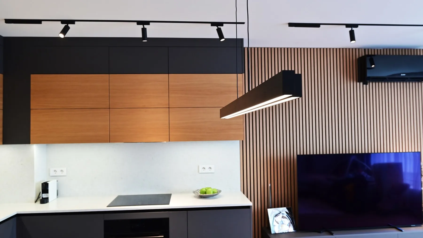Топлите тонове и осветлението превръщат кухнята в място за общуване.