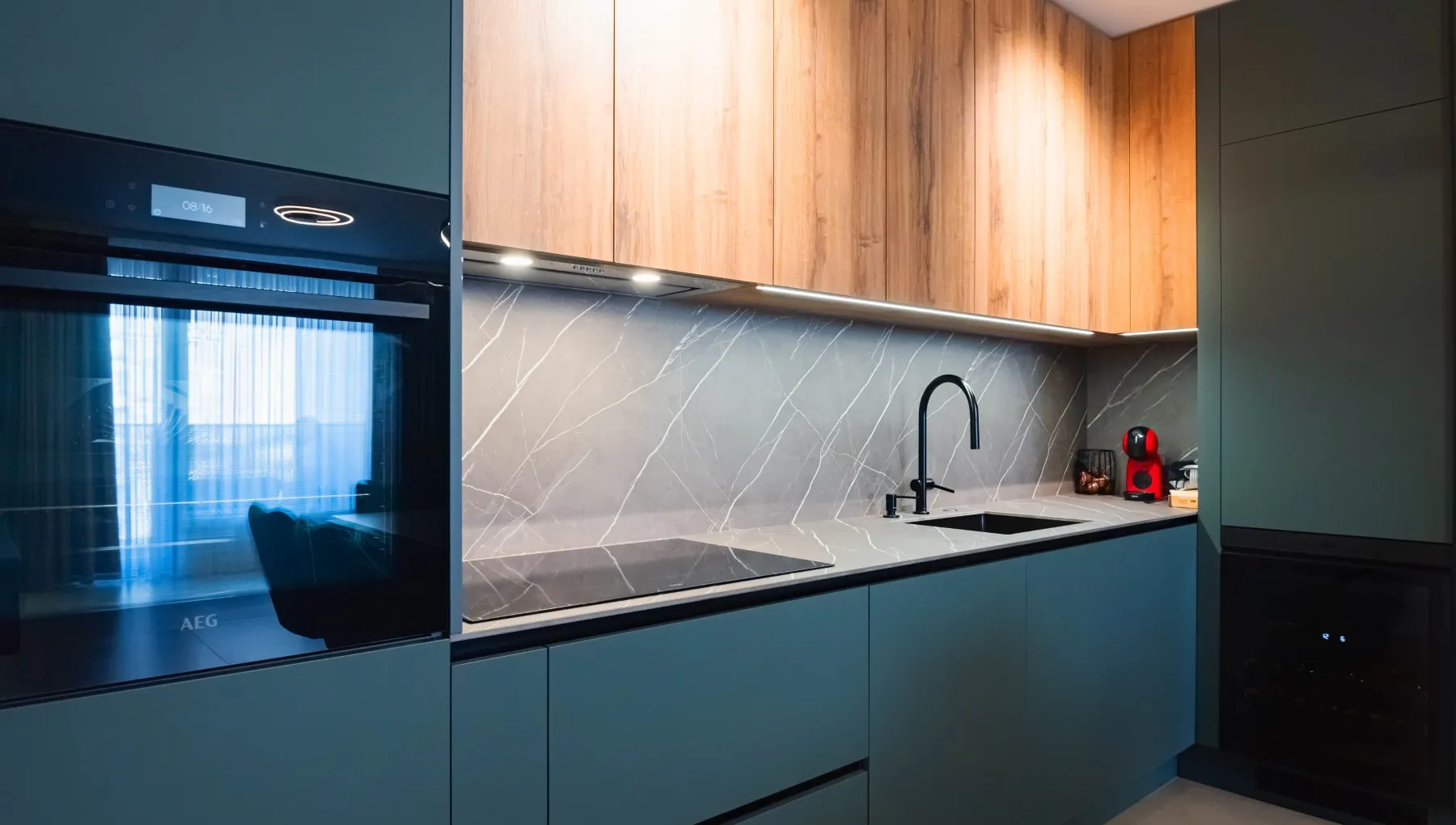 Ъгълът често остава по-тъмен. LED ленти под горните шкафове, насочени осветления и вградени светлини подобряват видимостта и удобството.