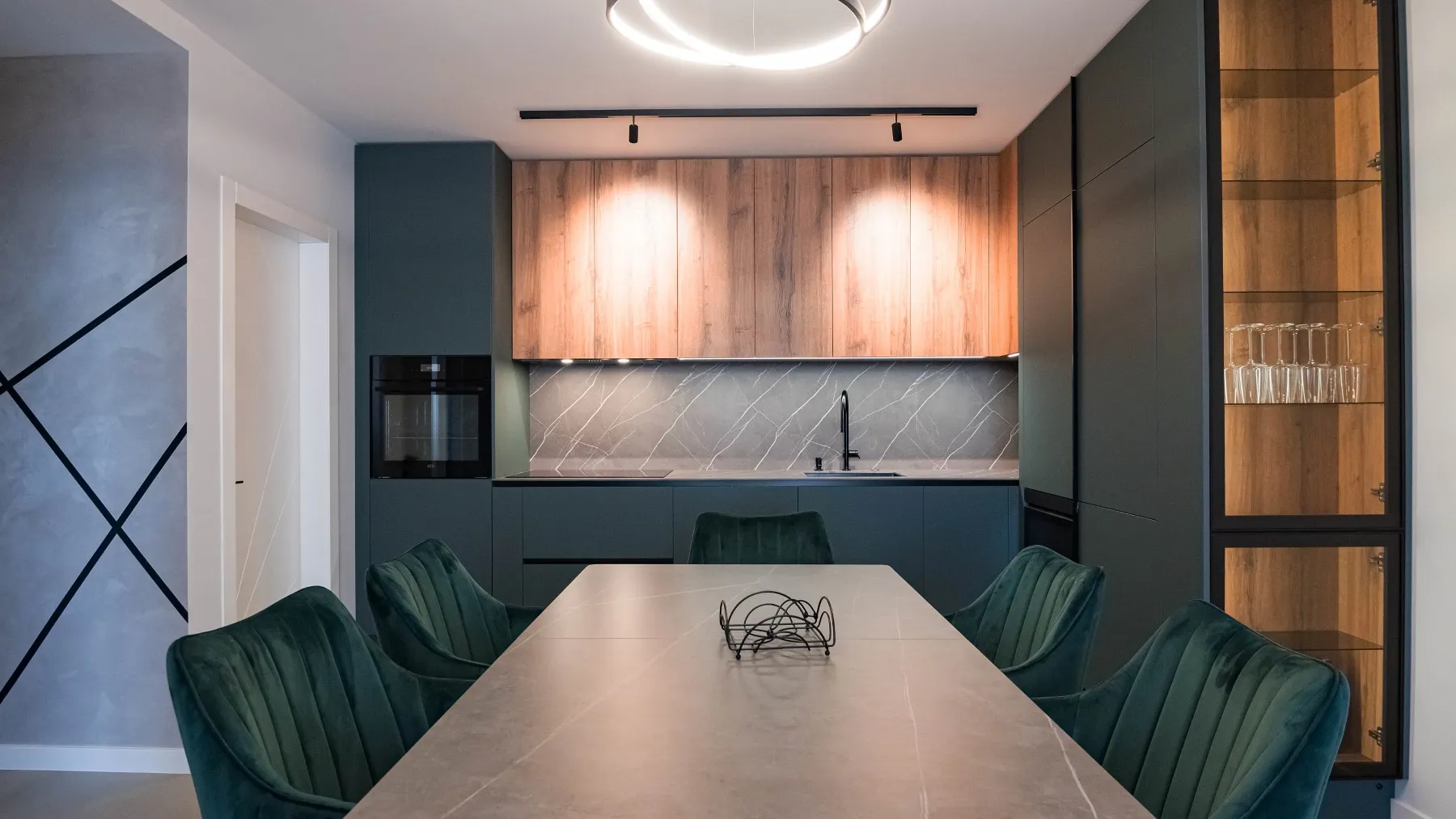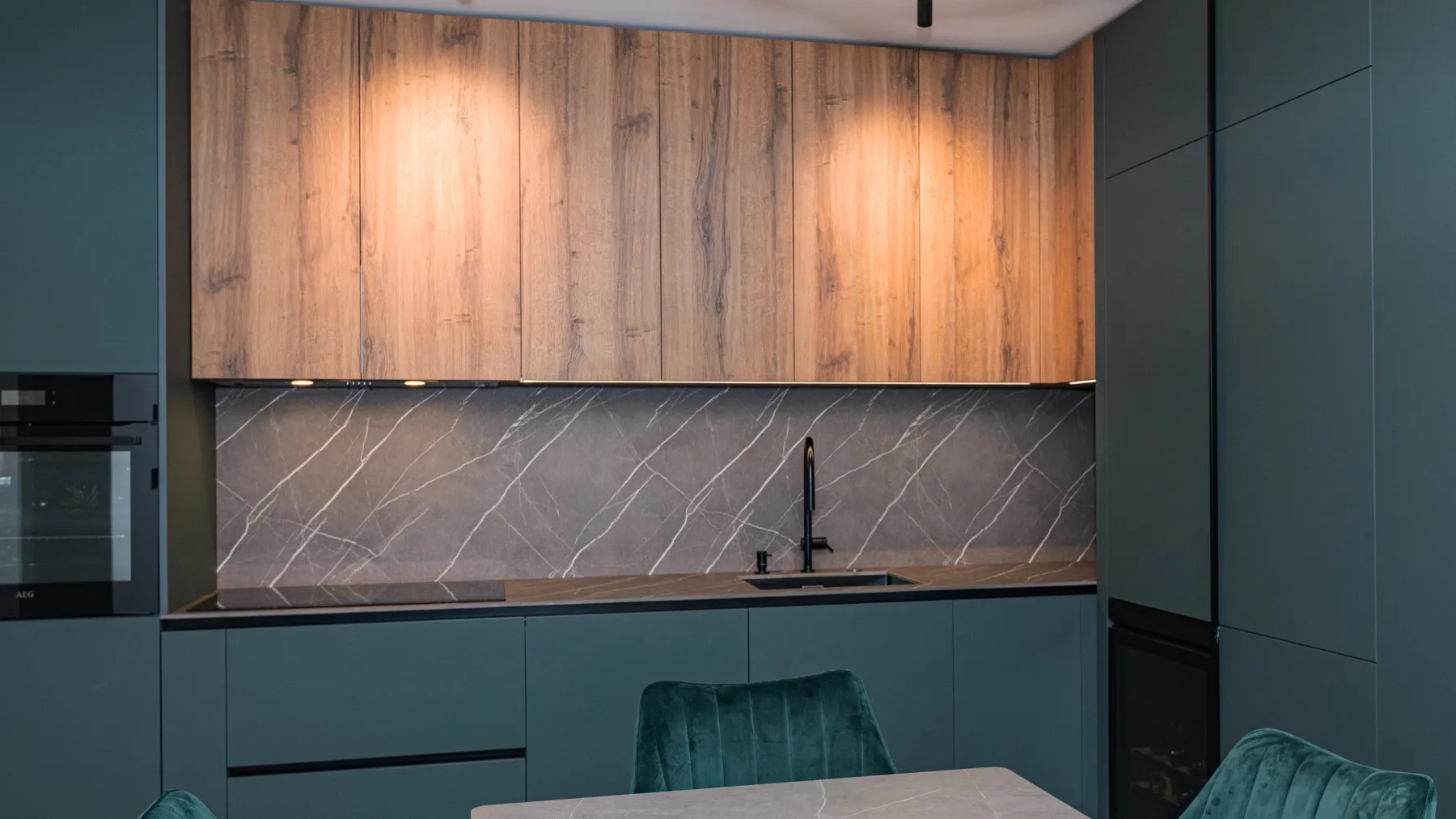 Този тип кухня е отличен избор както за малки помещения, където максималната ефективност е ключова, така и за просторни жилища, в които се търси удобна връзка между кухнята и дневната. Тя позволява добавяне на бар плот, полуостров или допълнителни висок шкафове.